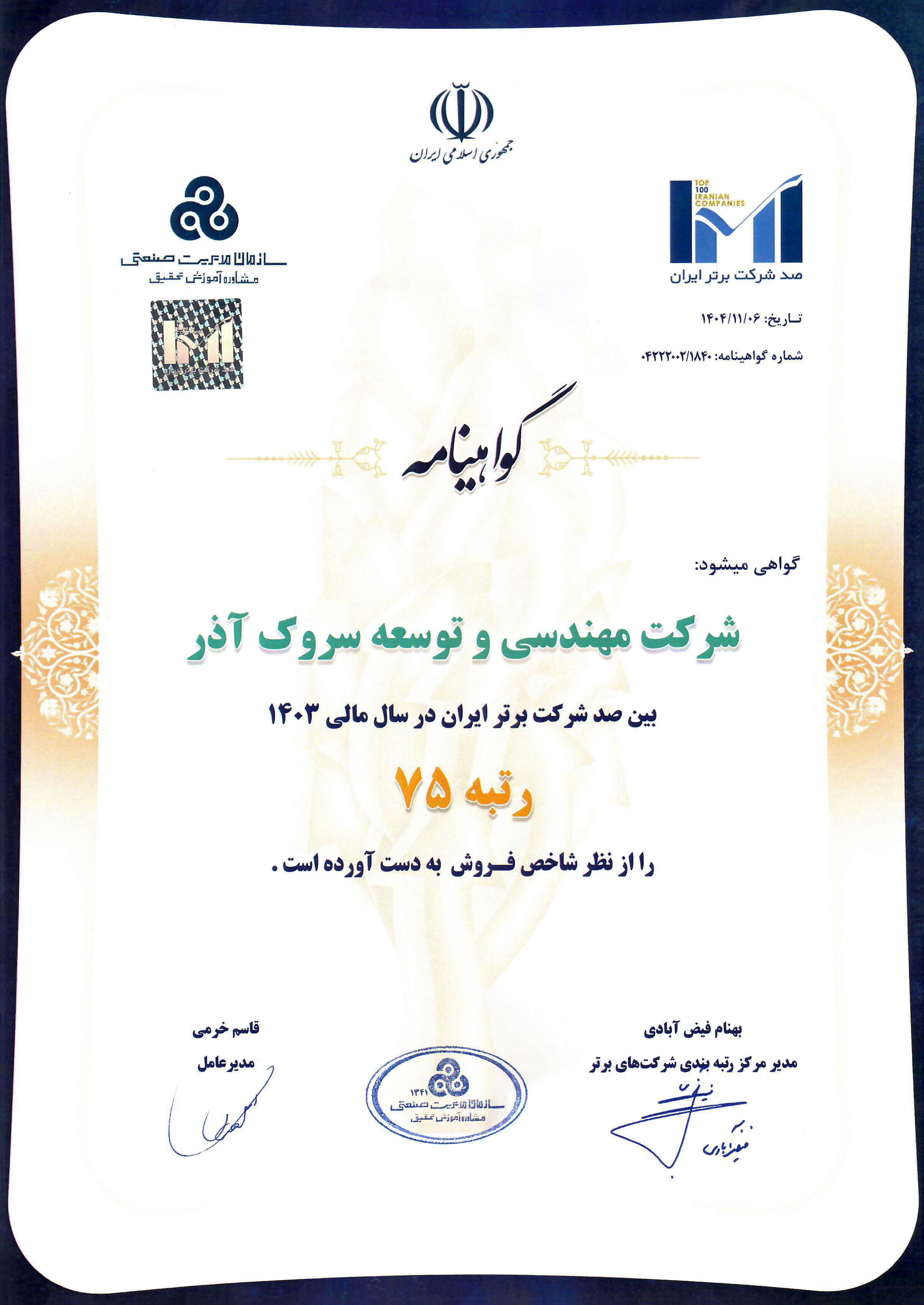 گواهینامه صد شرکت برتر ایران در سال 1403